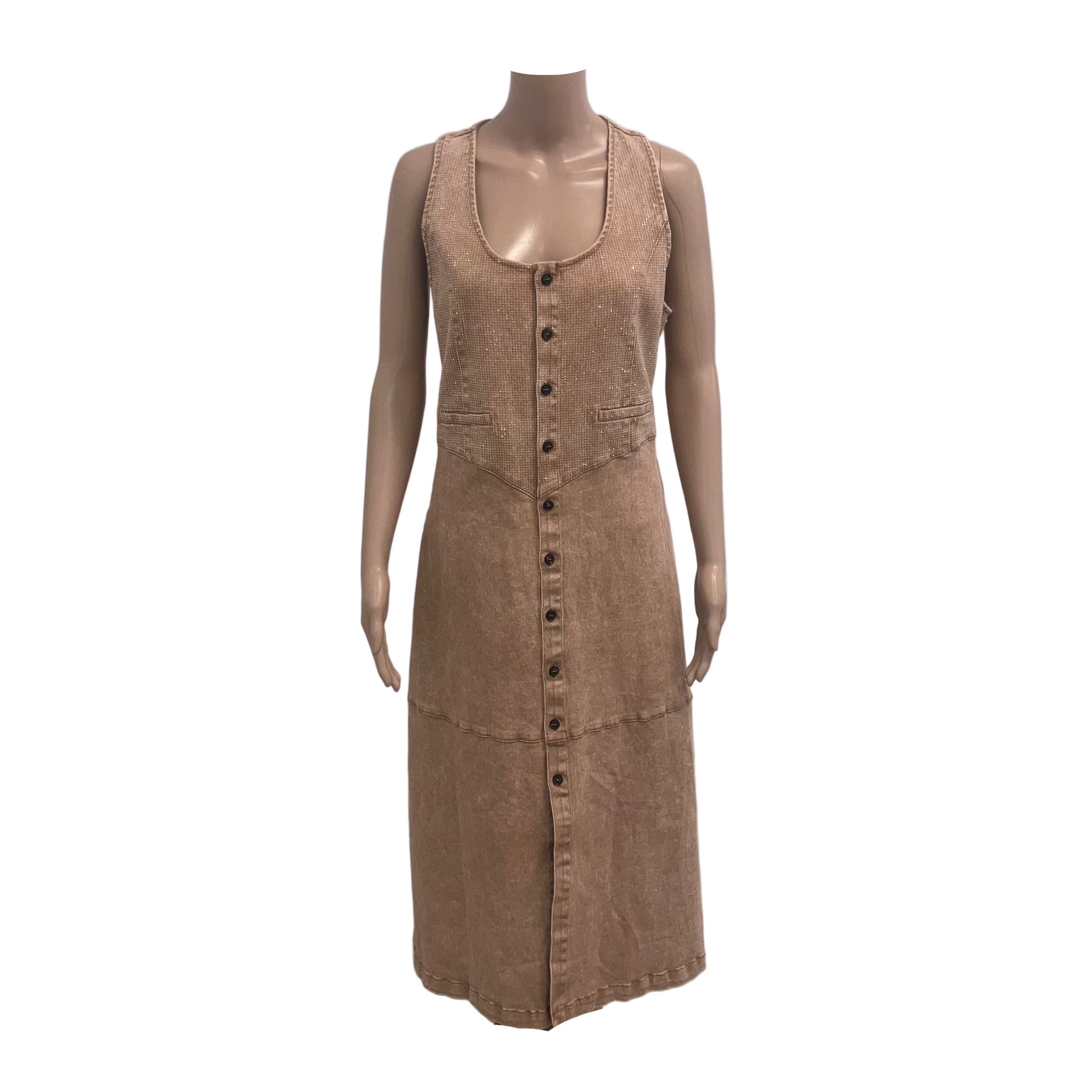 A sleeveless button-down brown denim dress showcases a casual yet chic aesthetic, accented with matching rhinestones along the buttons for a hint of sparkle. The durable denim fabric combined with the shimmering details creates a perfect blend of rugged and refined style.